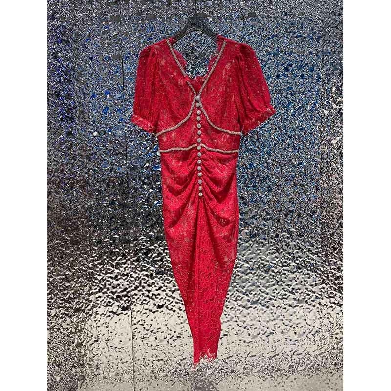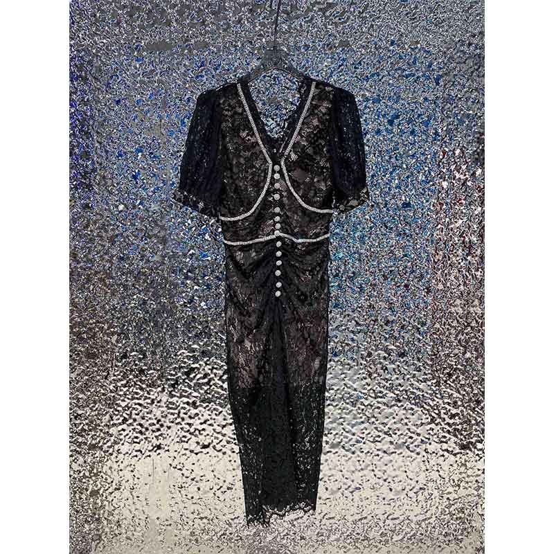 22 Spring Summer Runway Elegant Dresses For Women See Through Lace Rhinestone V Neck High Waist Slim Midi Dress 2 Colors
