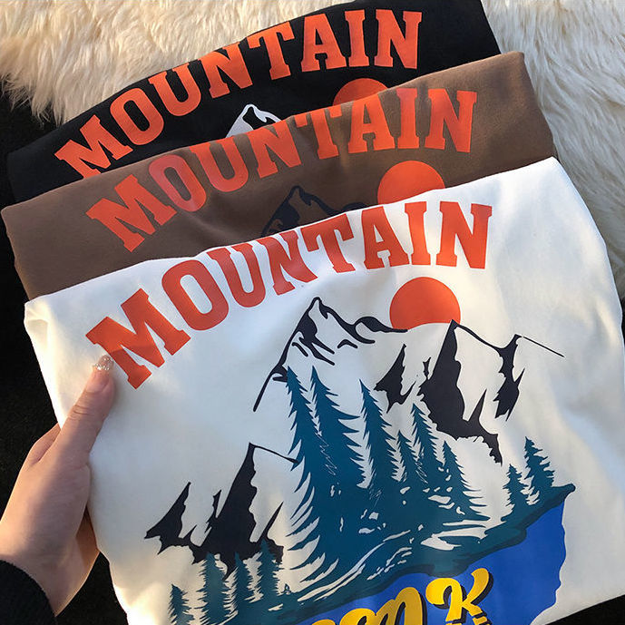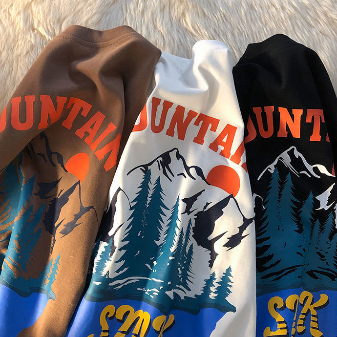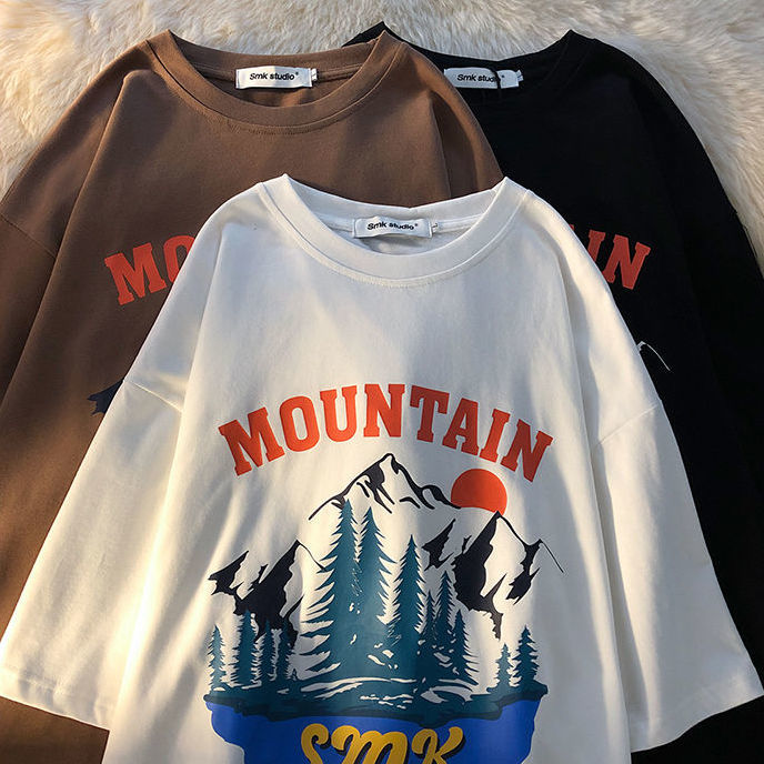 American retro snow mountain landscape printing short sleeved t-shirt men and women ins summer loose casual wild half sleeve