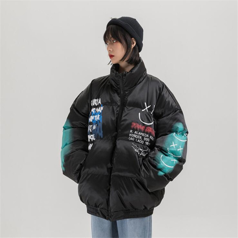 Hip Hop Thick Jacket Parka Happy Graffiti Print Men Windbreaker Streetwear Harajuku Winter Padded Jacket Coat Warm Outwear