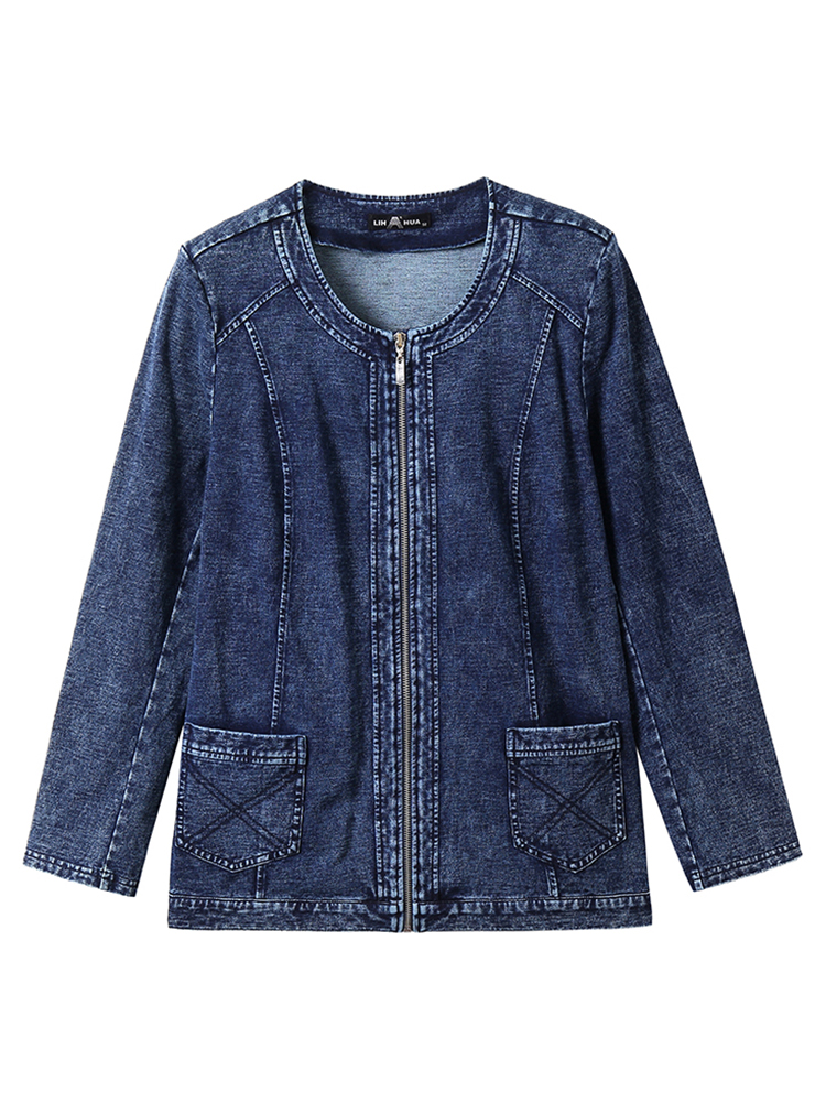 LIH HUA Women's Plus Size Denim Jacket Fall Casual Zipper Jacket High Stretch Cotton Knitted Denim