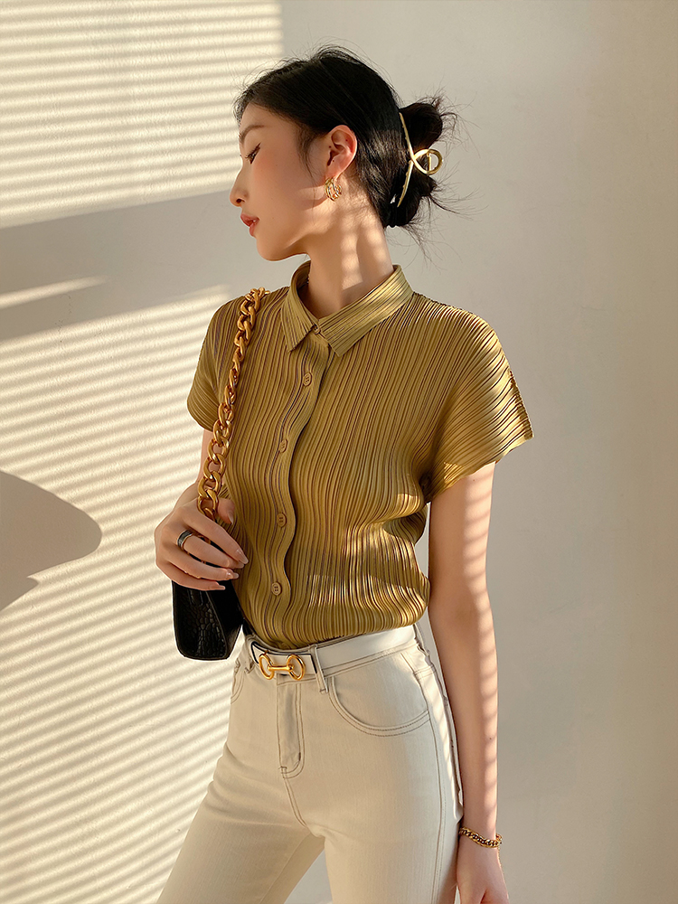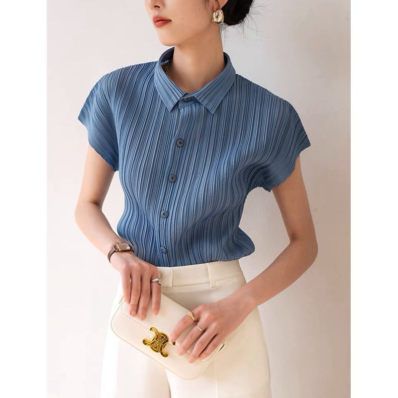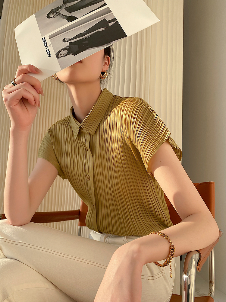 Miyake Pleated Tops Women Casual White Polo Lapel Short Sleeve Shirt Designer Clothes