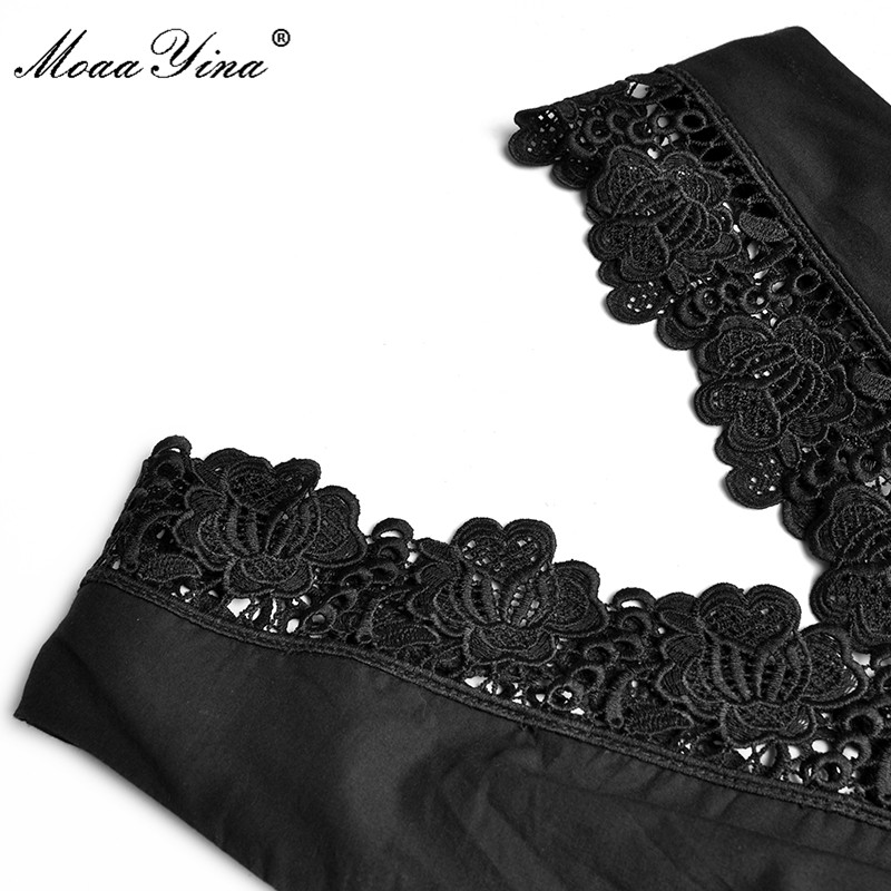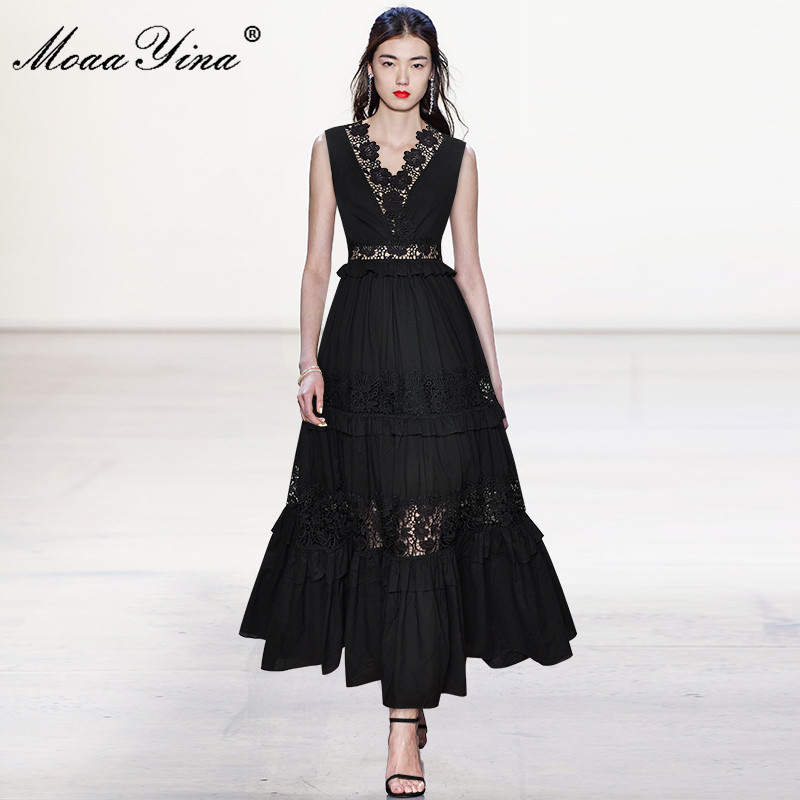 MoaaYina Runway Summer Black Party Dresses Women's Holiday V-neck Sleeveless High waist Hollow out Lace Long Dress