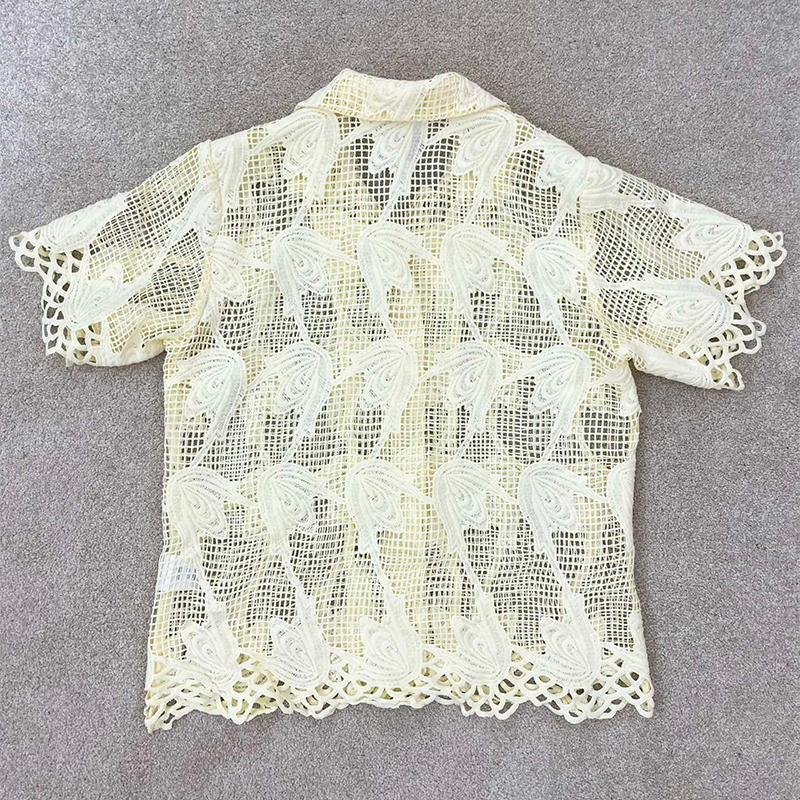 OROT@ Summer 2 Colors Polyester Hollow Lace Short Sleeve Lapel Daily Casual Cardigan Blouse
