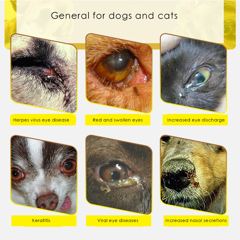 Range of efficacy: It can be used for symptoms such as red and swollen eyes, increased secretions, and increased nasal discharge caused by viral rhinobronchitis in cats. It can also be used for canine herpes keratitis and eye problems caused by canine fever and other viral diseases. .
