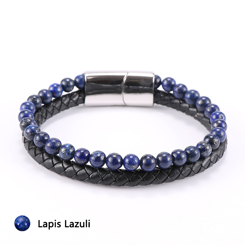 Item::Vintage Men's Jewelry Black Genuine Leather & Natural Stone Bead Bracelet Stainless Steel Magnetic Buckle Homme Wristband Bangle