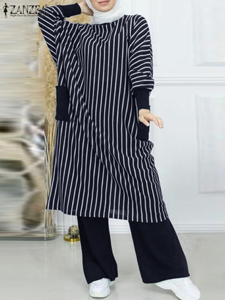 Vintage Muslim Sets Women Spring Striped Pants Sets ZANZEA Casual Long Sleeve Loose Long Tops Wide Leg Trousers Suits Tracksuits