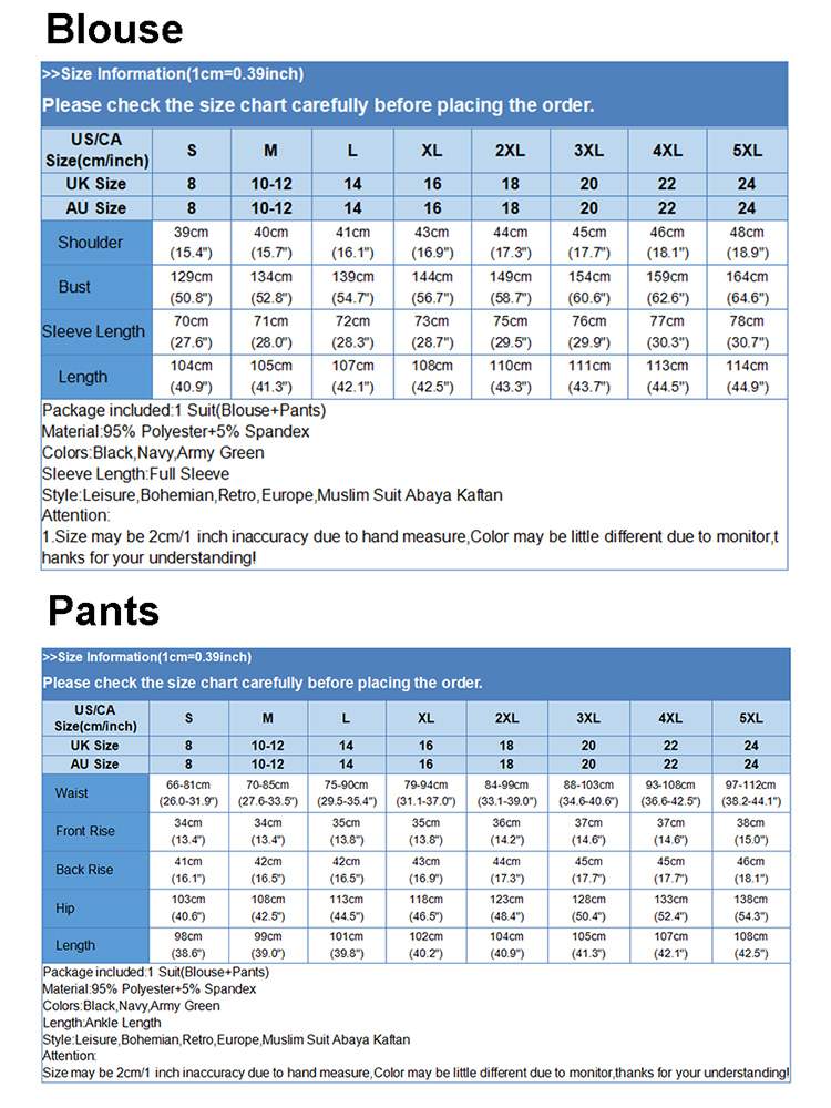 Package included:1 Suit(Blouse+Pants)