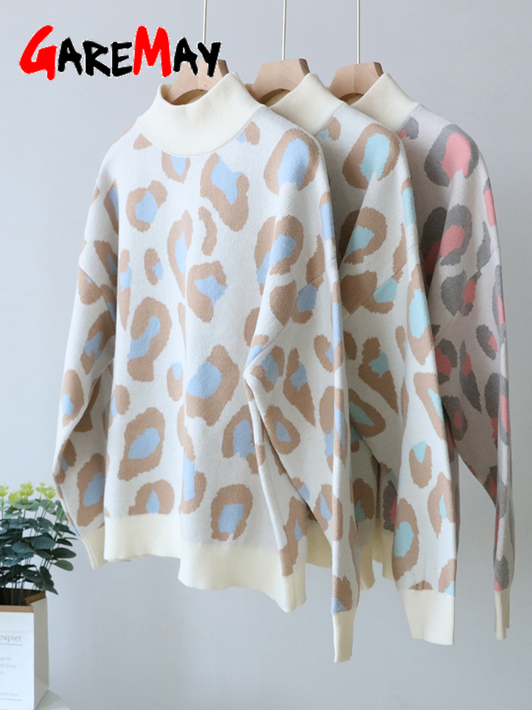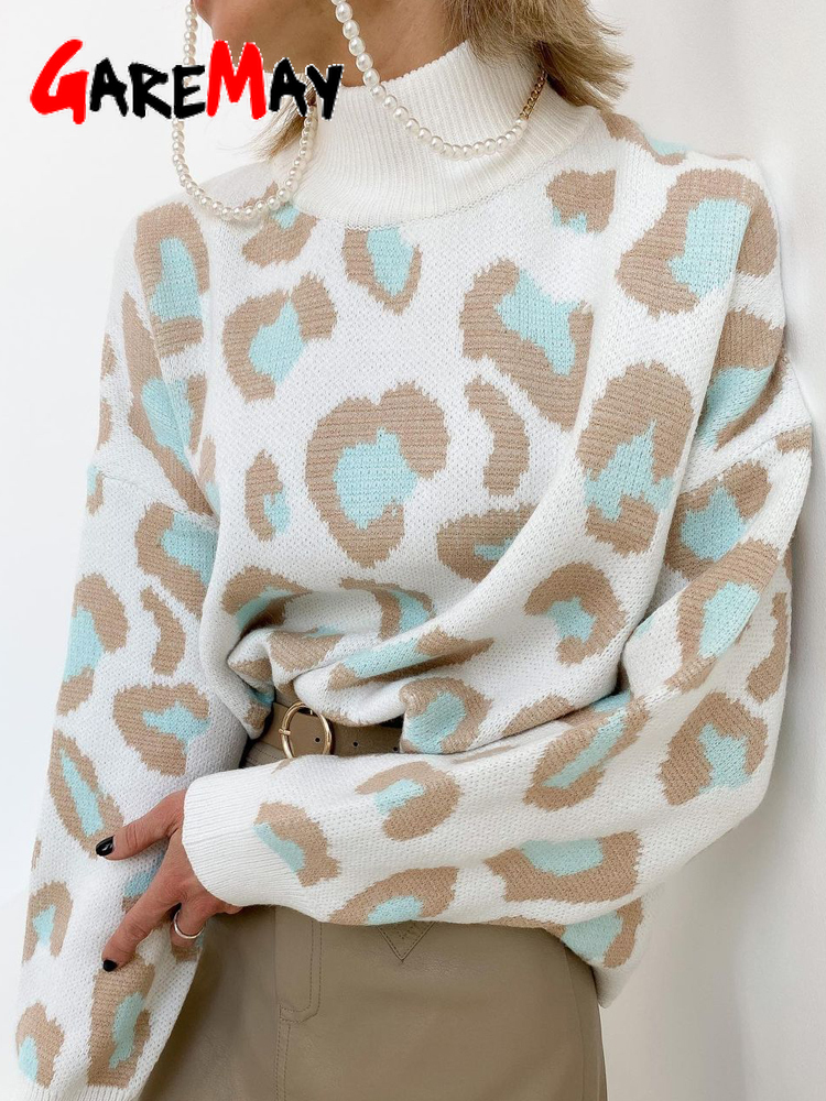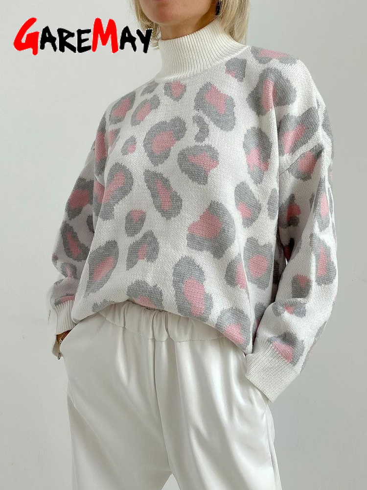 Winter Women's Sweater Leopard Print Animal Basic White Turtleneck Oversize Jumper Vintage Warm Knitted Sweaters for Women