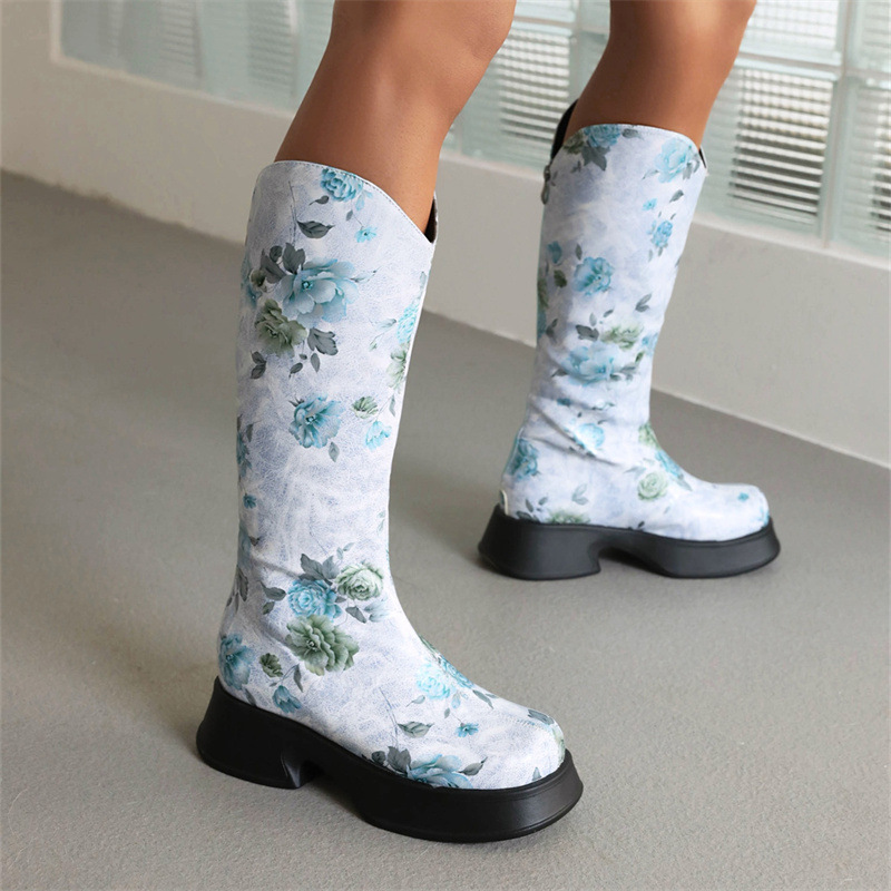 Women Boots 2022 Trend Luxury Winter Retro Round Head Small Platform Women Shoes Casual Mid Heel Print Ladies Knee High Boots