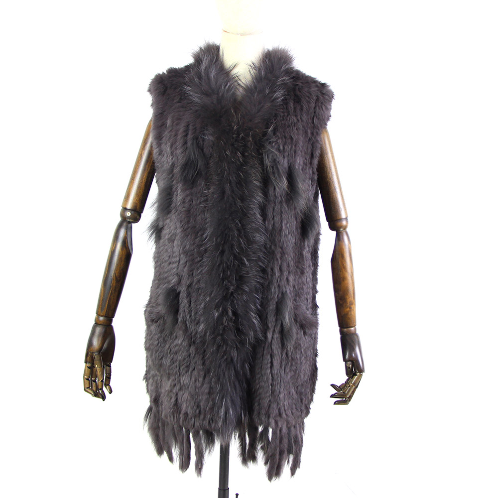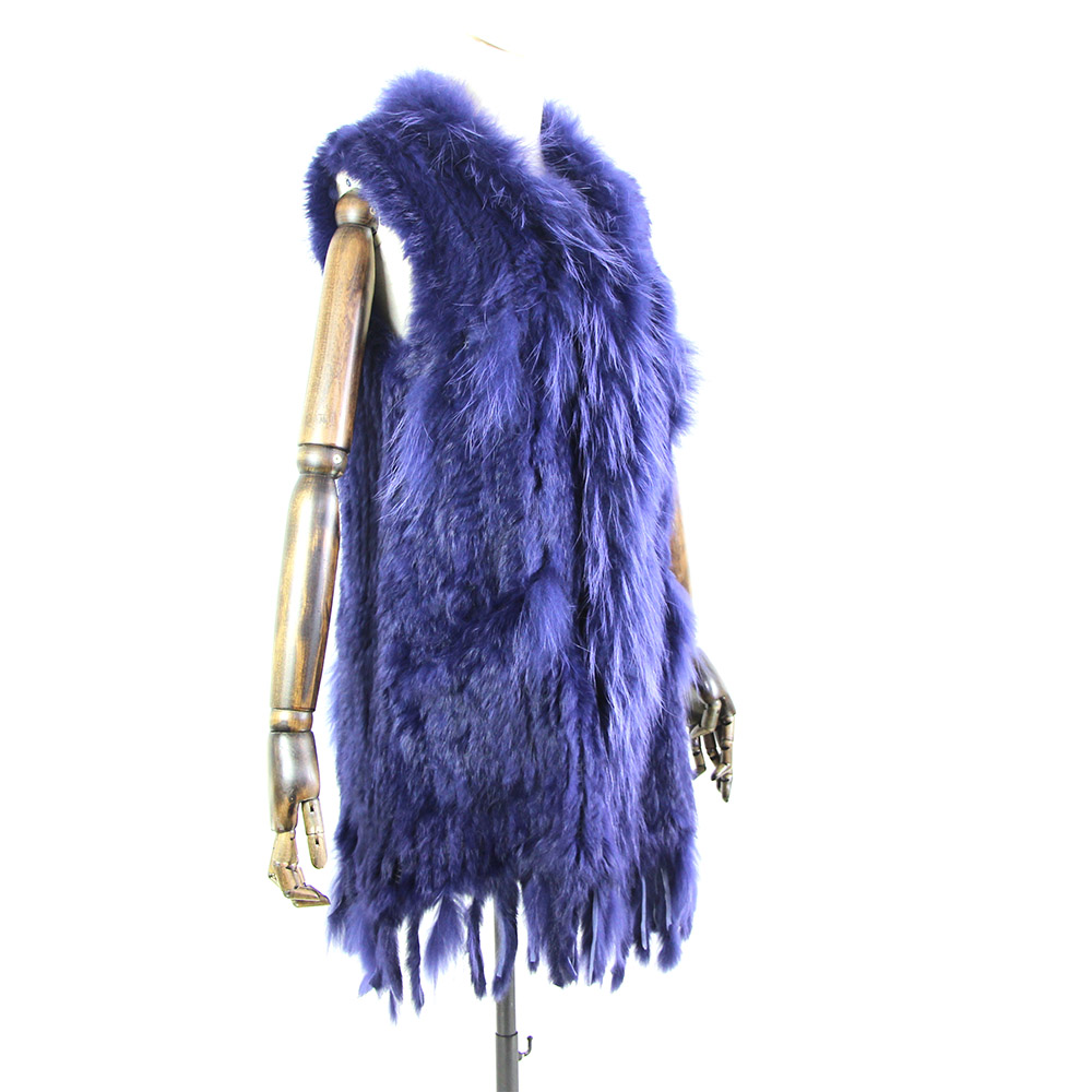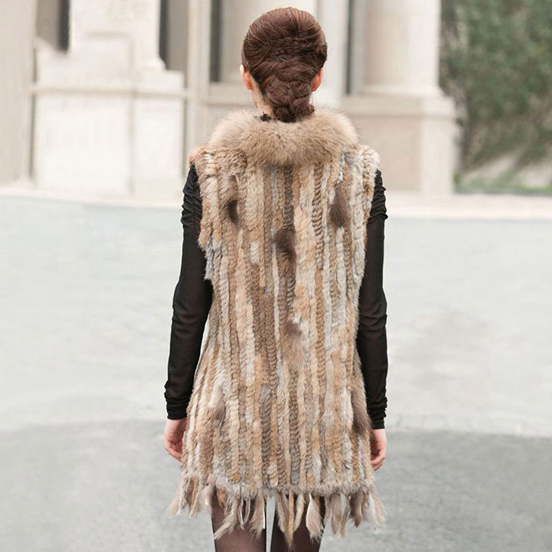 Women Genuine Natural Real rabbit fur Knitted Vests/Waistcoat/gilet coats with tassels Raccoon Dog Fur collar Long style