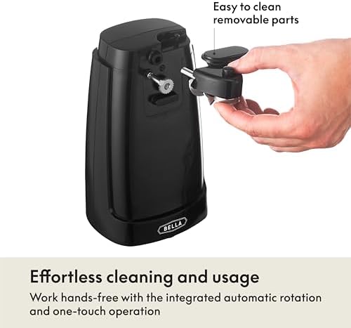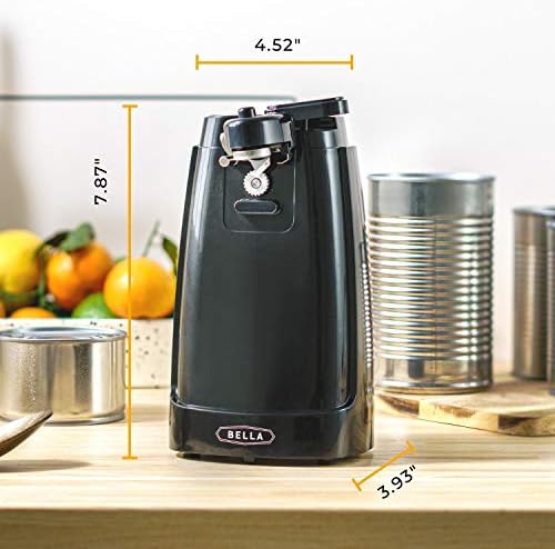 bellaelectric can opener with stanless steel blade, knife sharpener on back plus a cord storage.i chose the red.looks great on counter, does not take up alot of space.the plus?opens regular cans and has no problem opening larger cans !blade glides easily opening the can and detachable bladecomes outwith no problem for washing.good buy!
