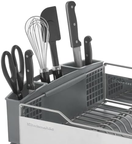 KitchenAid dish racks come in multiple sizes and configurations, from compact to full size, with a stemware rack that protects glassware from scratches and breakage, removable utensil caddies, and more. Strong and durable, these dish racks are rust-resistant and designed to direct water into the sink. Soft, non-slip feet secure the racks and protect sinks and countertops.