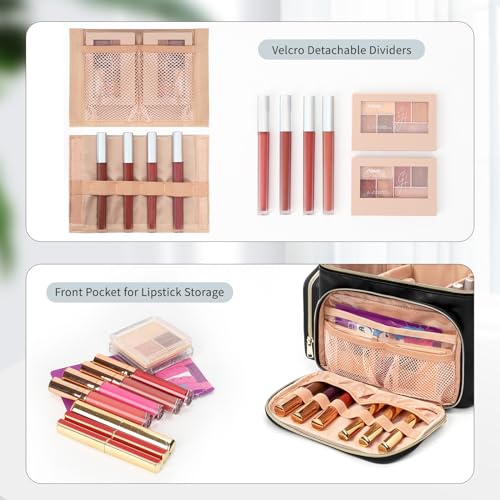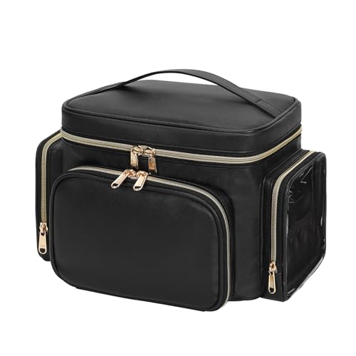 Large Makeup Bag, Portable Travel Makeup Bag Organizer for Women Girls with Makeup Brush Compartment & Two Side Pockets, Cosmetic Travel Bag Vertical Storage Toiletry Bag - Black