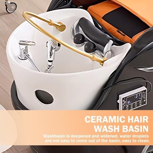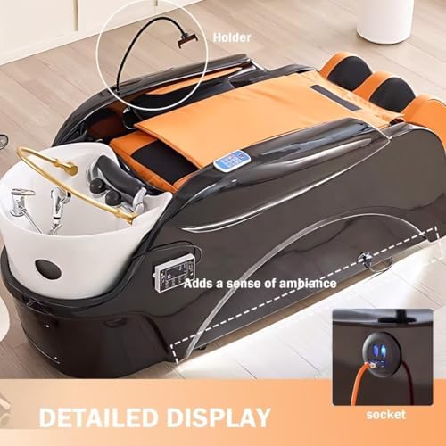 Salon Shampoo Bed-Electric Massage Table with Black Orange Luxury Design, Head Spa Equipment&Beauty Bed Includes Back Heating Massage, Water Cycle, Cell Phone Holder(76.77IN)