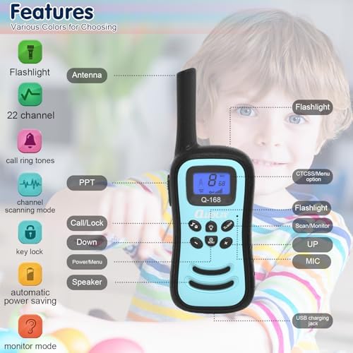 QUOLIX rechargeable walkie talkies built-in LED flashlight & LCD backlit display provide great convenience for kids to play at night.