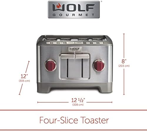 Wolf Gourmet 4-Slice Extra-Wide Slot Toaster with Shade Selector, Bagel and Defrost Settings, Red Knob, Stainless Steel (WGTR154S)