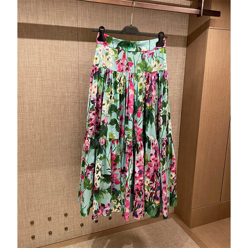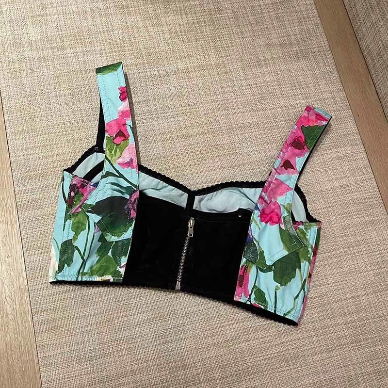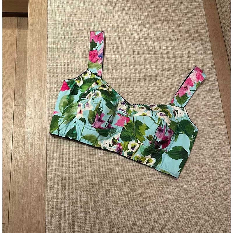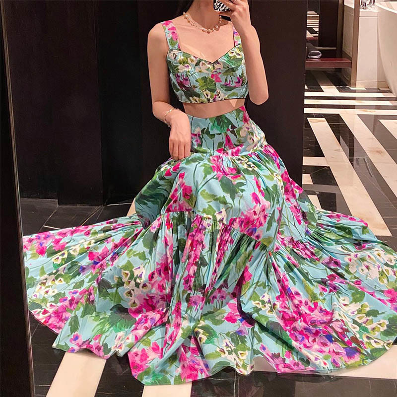 22 Spring Summer Runway Bluebell Print Pure Cotton Elegant 2 Piece Sets Fishbone Vest High Waist A-line Big Swing Skirt