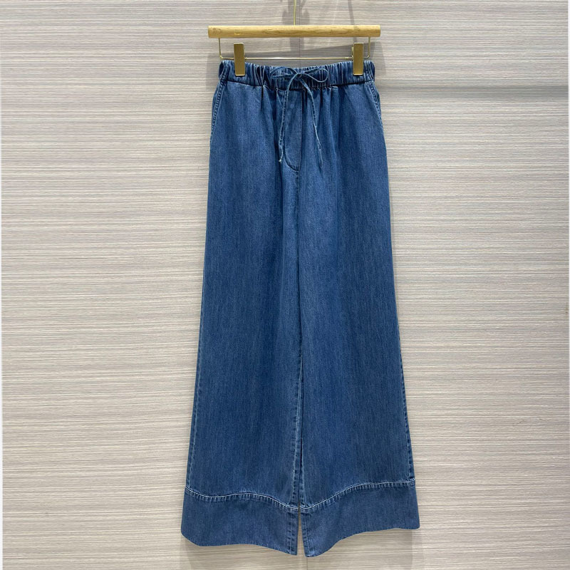 22 Summer Elastic Thin Denim Waistband Wide Leg Pants Women Casual Blue Wide Hem Trousers Luxurious V Hardware Straight TrouserA0458