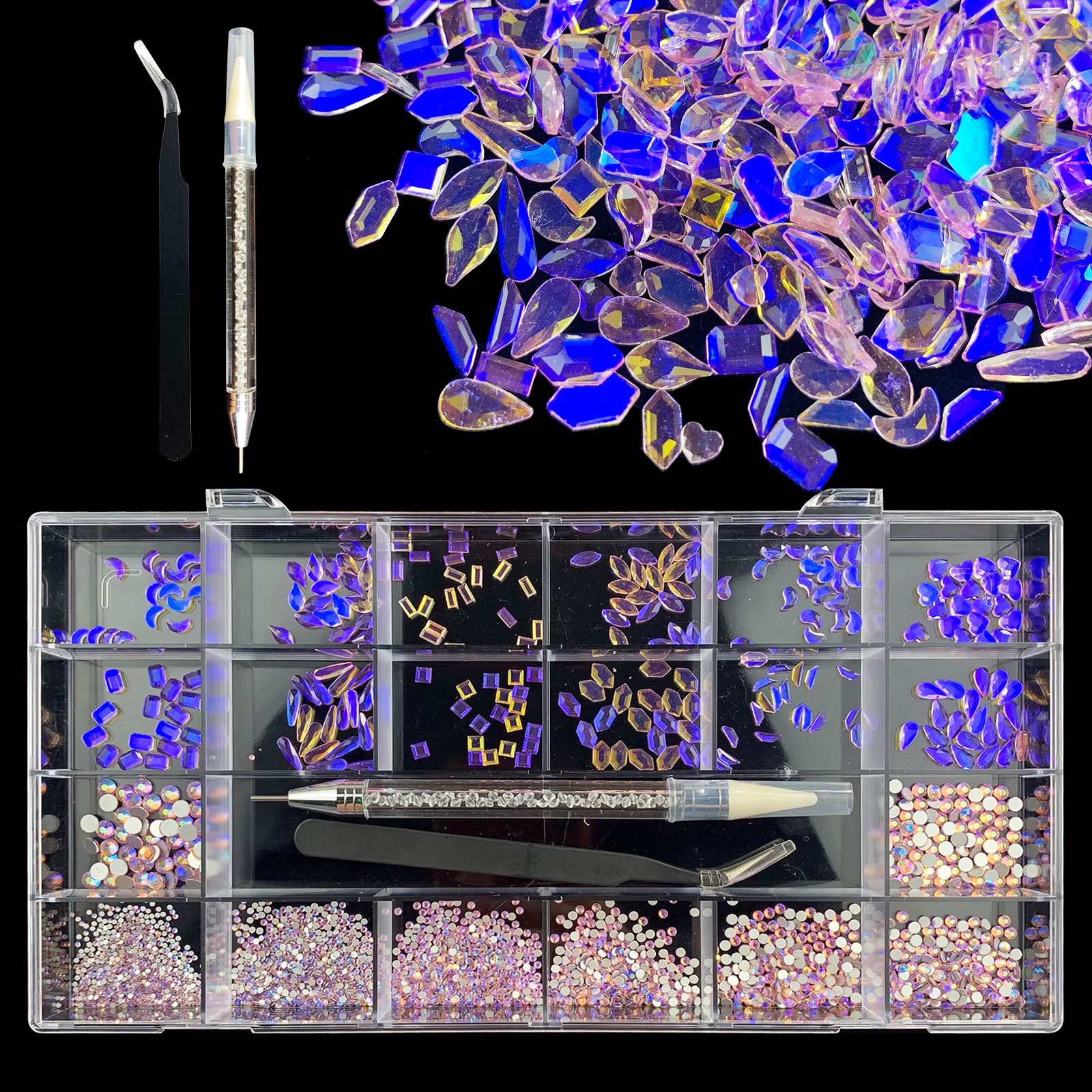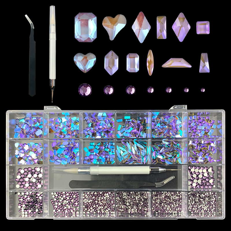 2). 2740pcs Rhinestone set: 240pcs(20x12) k9 crystal glass rhinestones, 2500pcs mix sizes round rhinestones,1pcs wax pen(Crystal or white), 1pcs tweezers for free