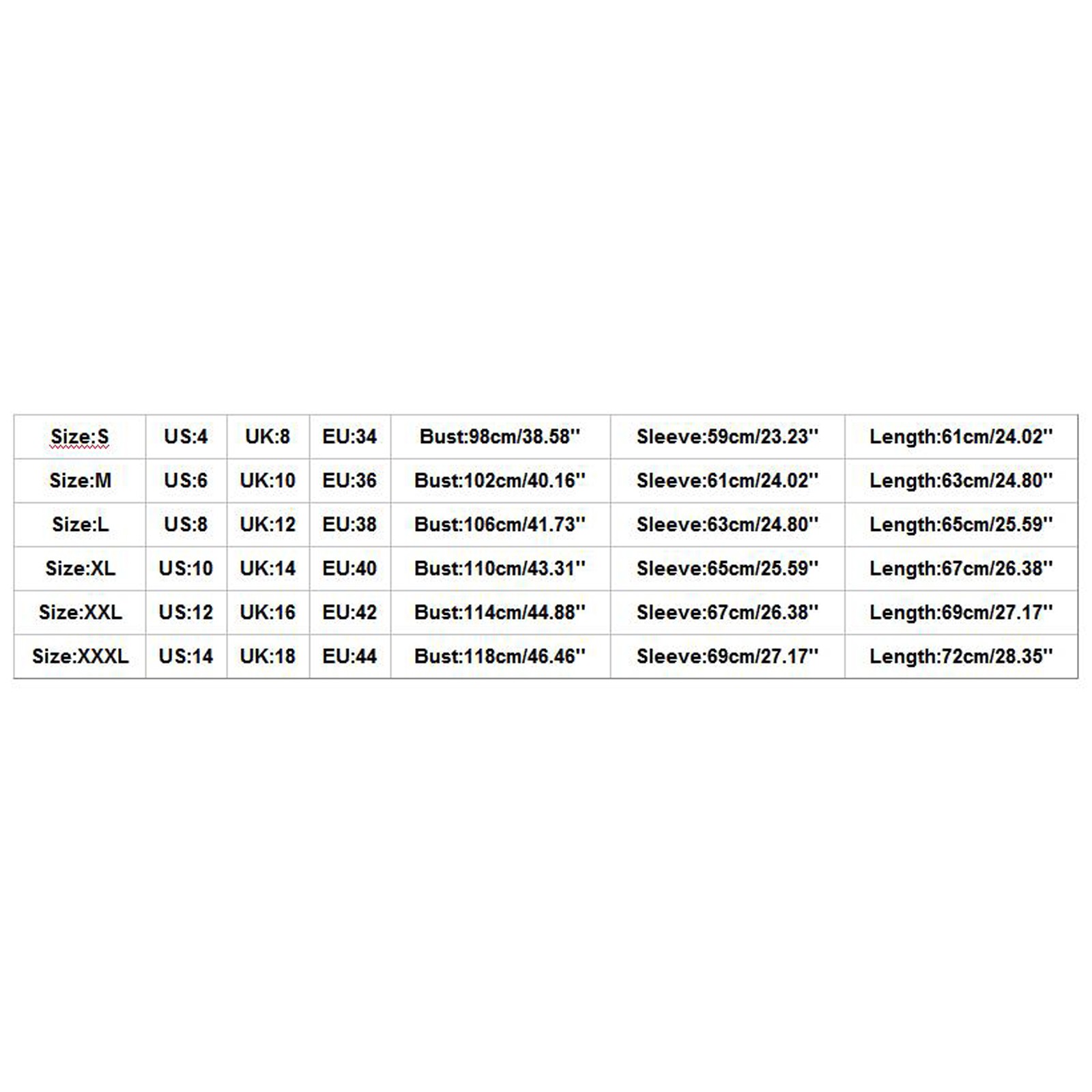 Size US UK EU Bust Sleeve Length