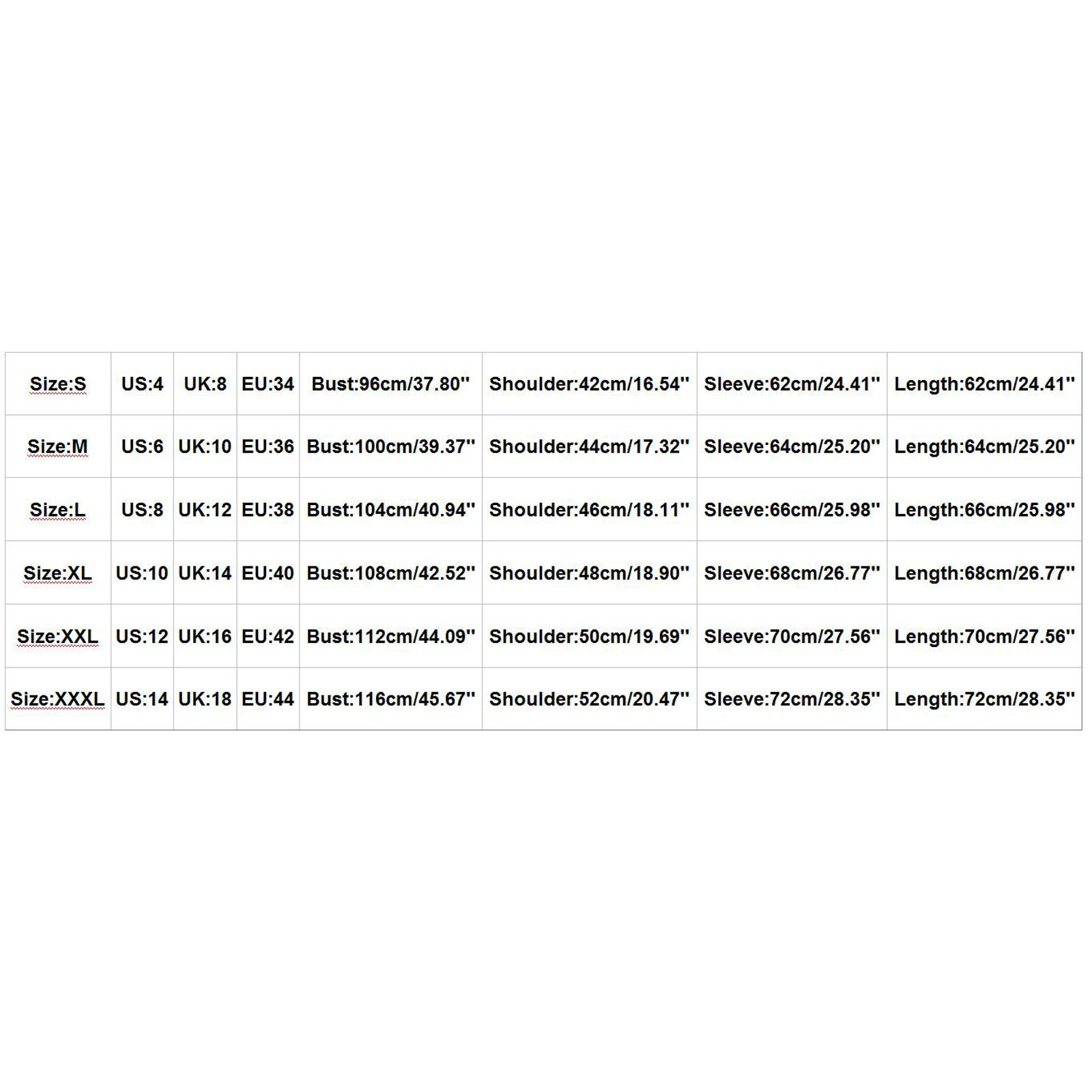 Size US UK EU Bust Shoulder Sleeve Length