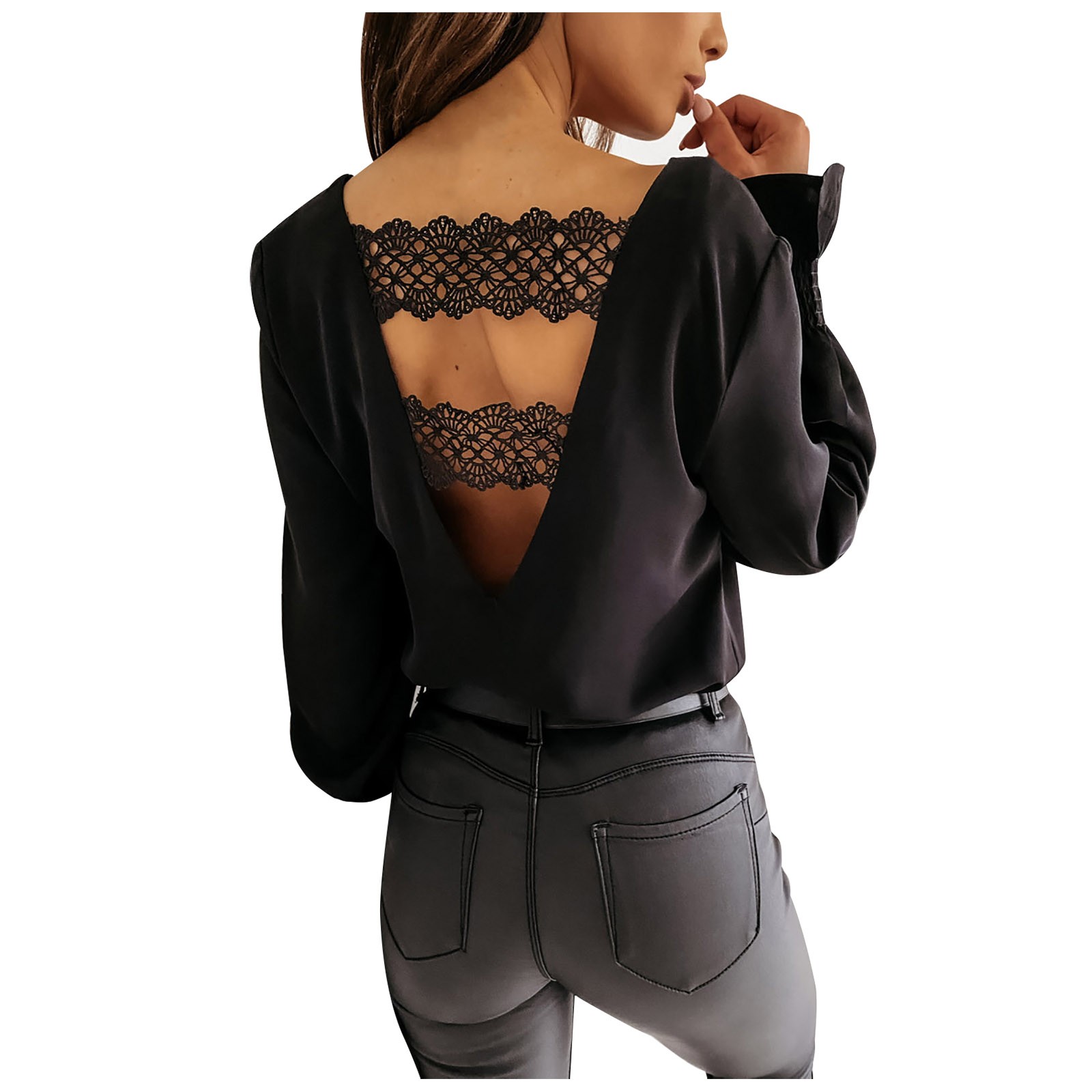 40# Women's Backless Blouses tops Lace Splicing deep V-neck Back Flared Long-sleeved Blouses Shirts Tops streetwear black Shirts