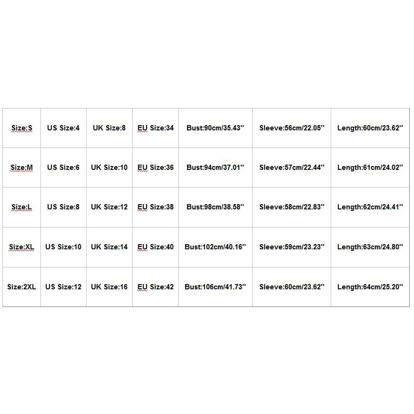 Size US Size UK Size EU Size Bust Sleeve Length