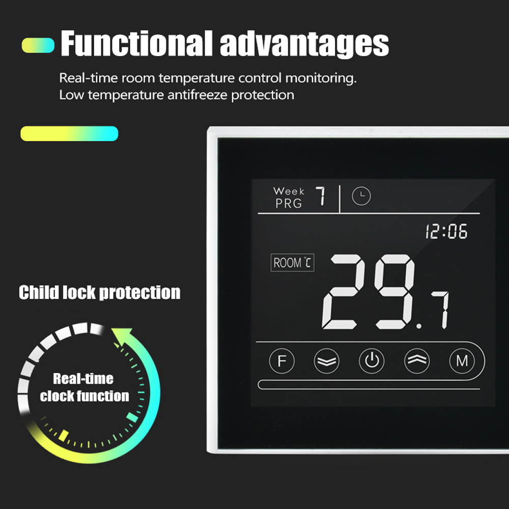 Support 5+2, 6+1 days Weekly Programmable, six periods programmable controlling temperature setting.