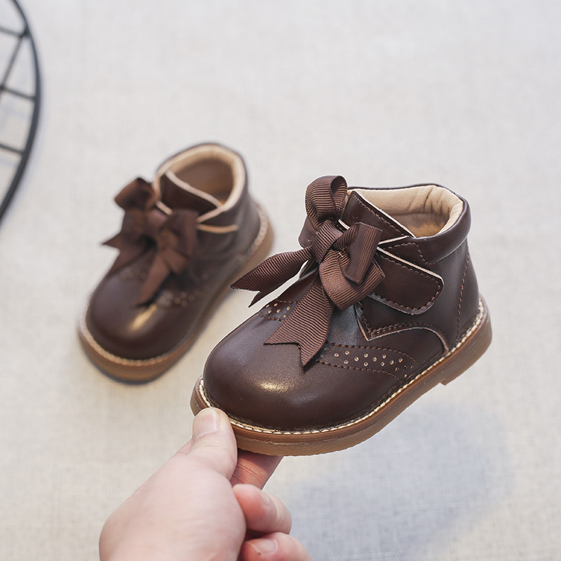 2021 Anti-slippery Genuine Leather Baby Girls Boots with Butterfly-knot Casual Flat Heel Autumn Winter Baby Girl Shoes E08044