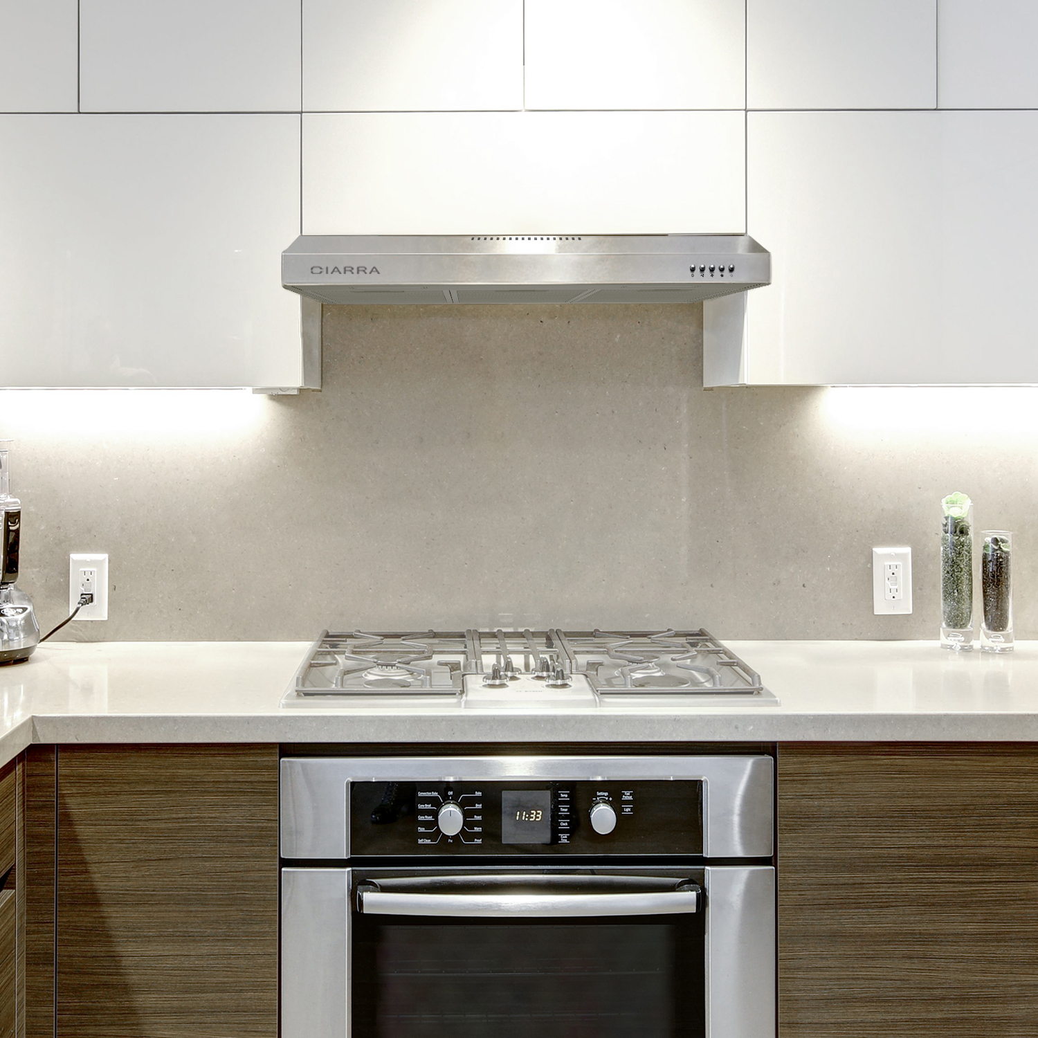 CIARRA under cabinet range hoods ensure powerful ventilation performance for an odourless and fume-free kitchen.