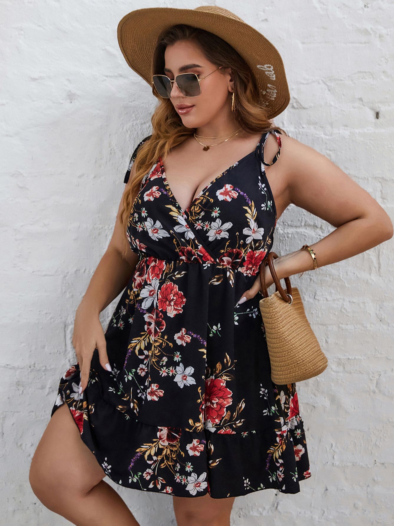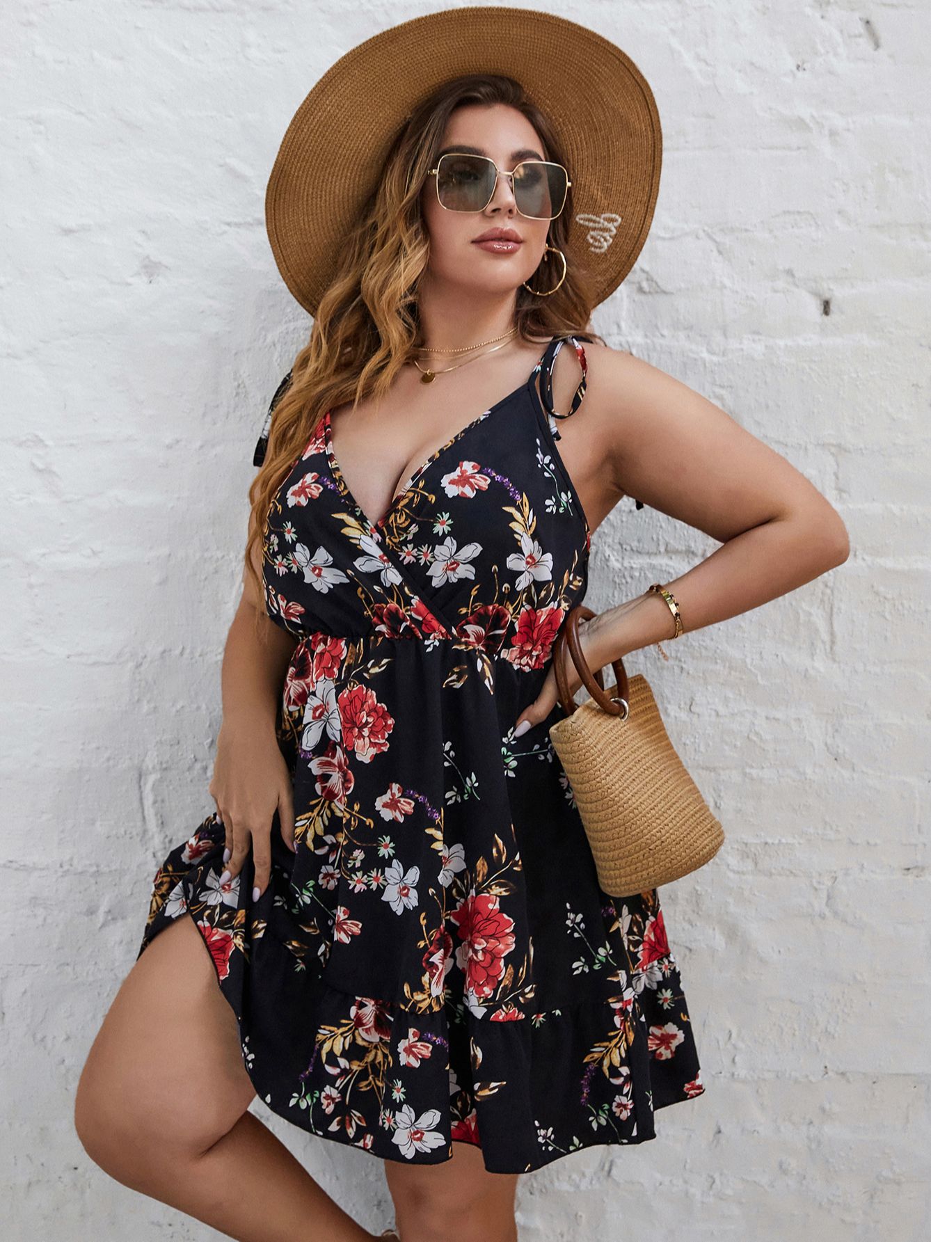 EARO Black A Line Dress Plus Size Floral Print Summer Sleeveless V Neck Sexy Elegant Spaghetti Strap Evening Party Dresses