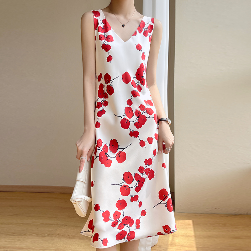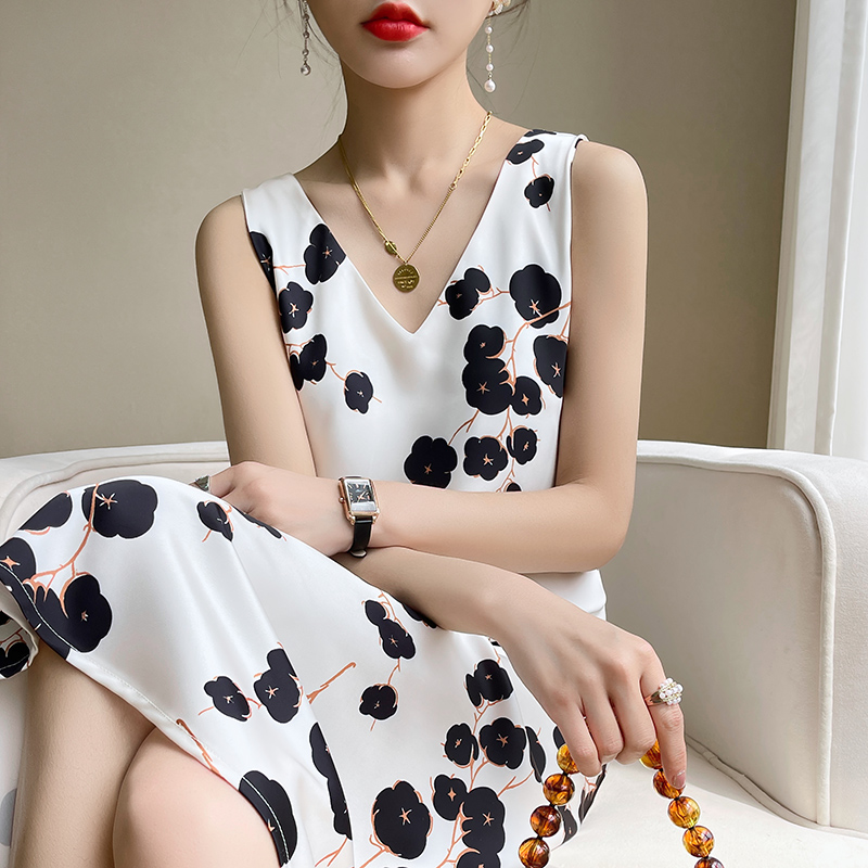 Explosive French Acetate Sling Dress Women's Summer Waist Long Skirt High-End Printed Skirt Suit Matching
