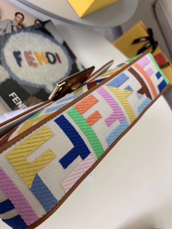 Iconic Baguette bag in medium size, with flap and FF fastening with magnetic clasp. Lining with zip pocket. Can be carried by hand or worn cross-body thanks to the handle and shoulder strap, both detachable. Made of beige canvas. Finished with FF motif embroidered in multicolour thread. Details in brown leather. Gold-finish metalware.