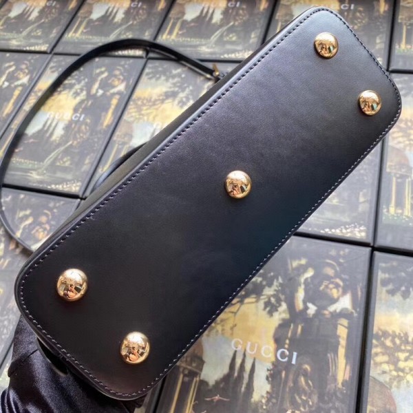 A new silhouette introduced to the Gucci 1955 Horsebit line for Spring Summer 2020, the top handle has a domed shape with an optional leather shoulder strap, crafted from black leather. The collection unifies details first introduced on the original bag that inspired the line from over six decades ago with a modern spirit, highlighting the Horsebit. Part of Gucci’s genetic code, the double ring and bar design has been established as one of the most distinctive elements among the House symbols borrowed from the equestrian world.