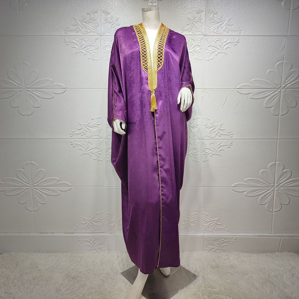 Muslim Kimono Abaya Velvet Gold Ribbon Batwing Sleeve Open Front Gown Dress for Women Arabic Moroccan Turkey Caftan