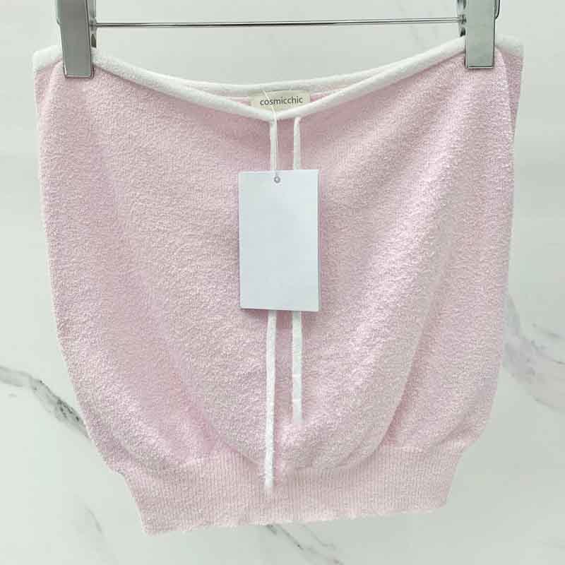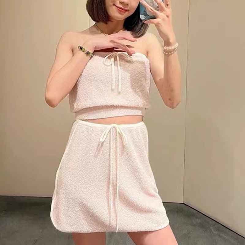 2022 New Pink Tube Top Knitted Set Sexy Lace-up Design Waist Sleeveless Tee High Waist Short Skirt Fashion Casual Sets For Women.A0738