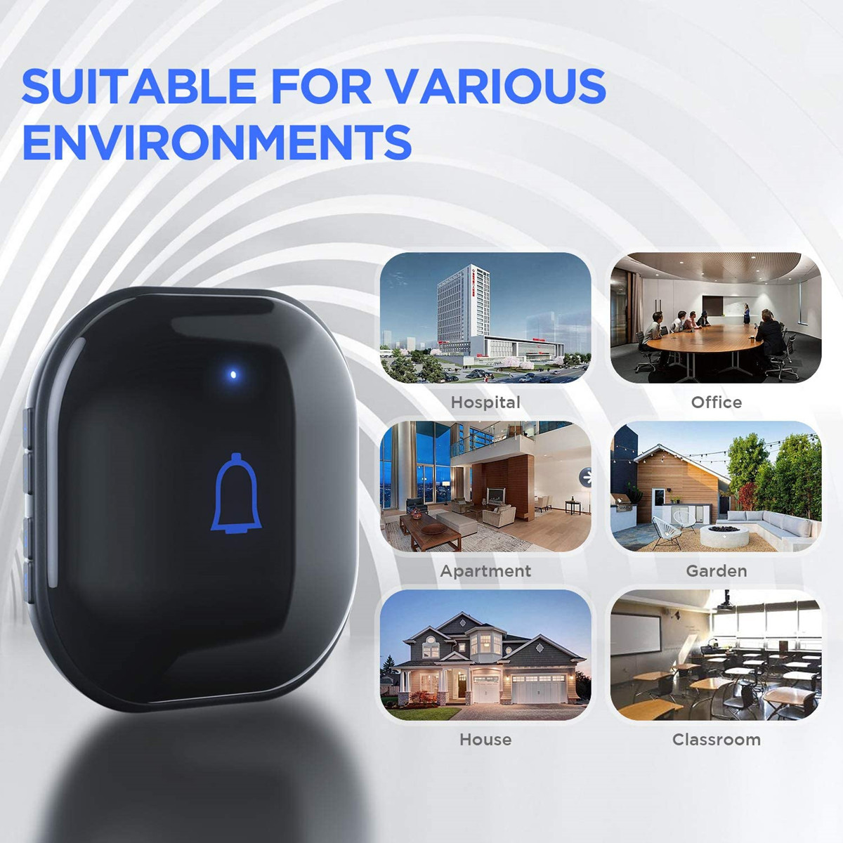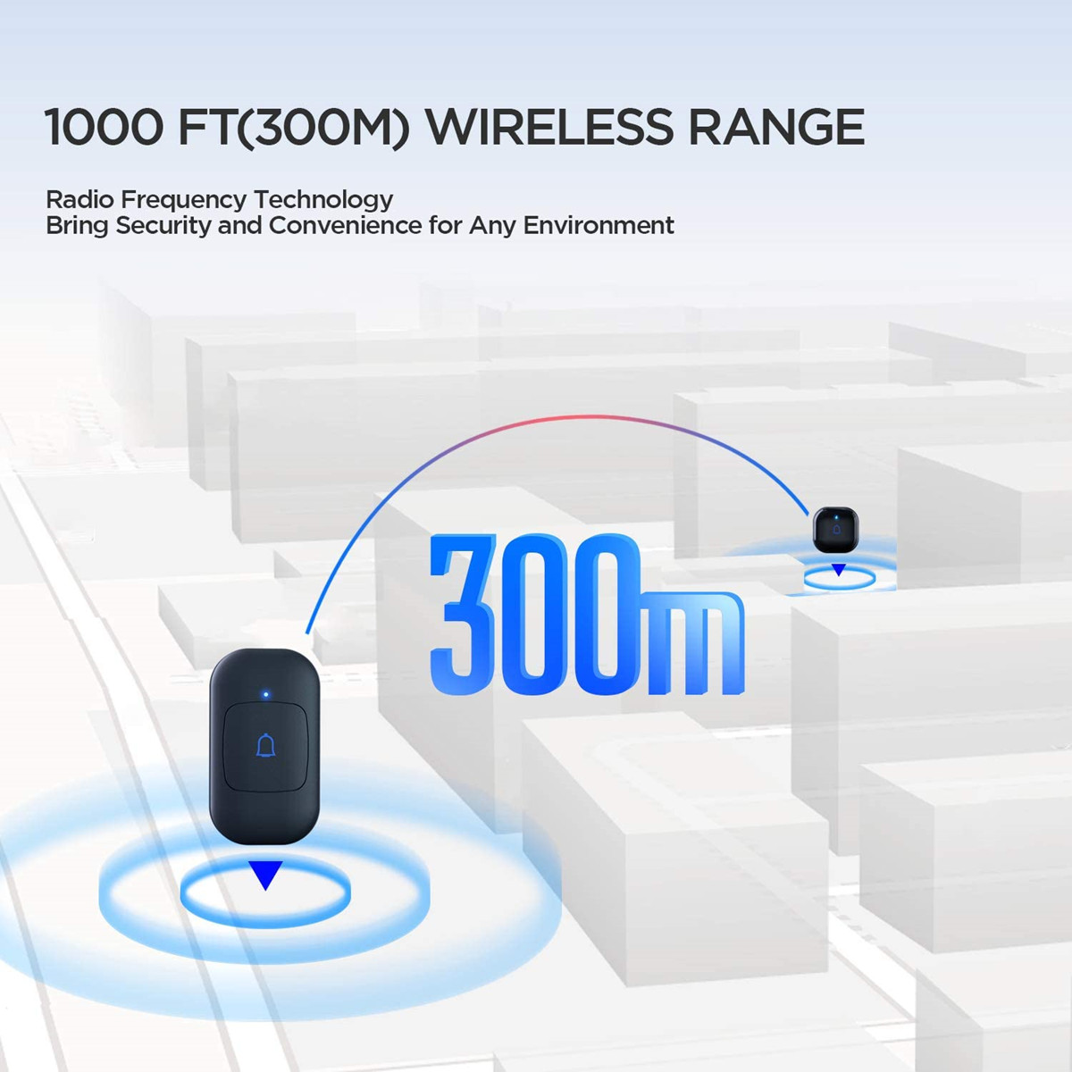 The door bell ringer wireless with a reliable wireless range of 1,000ft/300m in open area and strong signal penetration, the doorbell will never fail to alert you when someone shows up at the door.The doorbell wireless is the best choice for homes ,classroom, office and any other occasions.