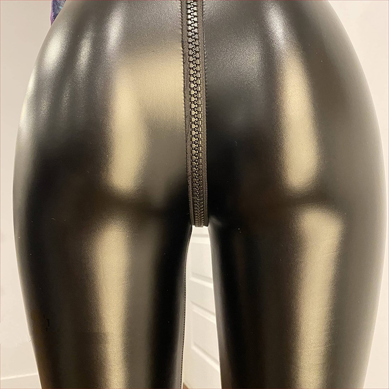 Women’s tight fitting stretchy shiny black leather head to head sliders crotch zipper leggings pants makes a wonderful gift to oneself or someone who you know. We use a number 10 size moulded plastic zipper. Our zipper is conspicuous on purpose. It is suggestive. There are two sliders facing each other. The fabric is thinner, stretchy and somewhat shiny. It is less shiny than the super shiny vinyl fabric. We love these leggings or Capri if you are tall or have long legs because they hug every curve yet black favours every detail.