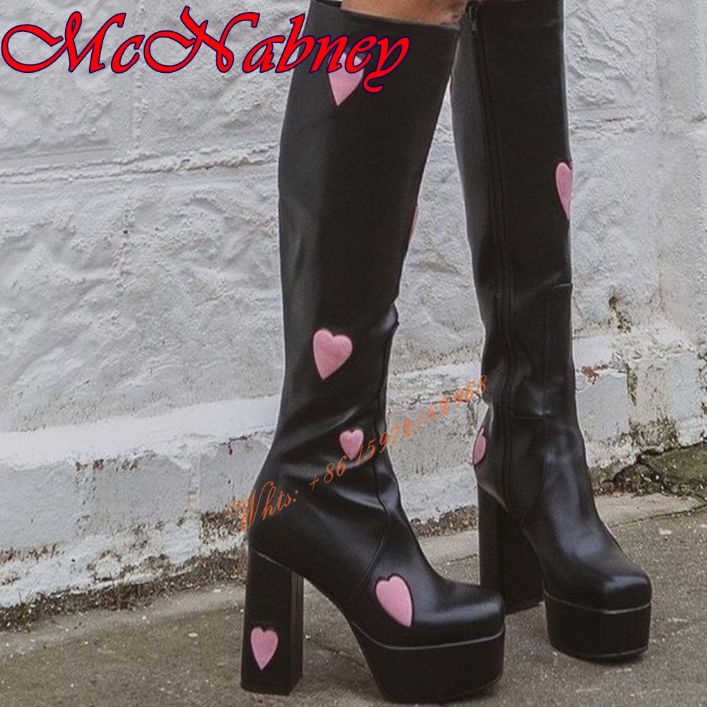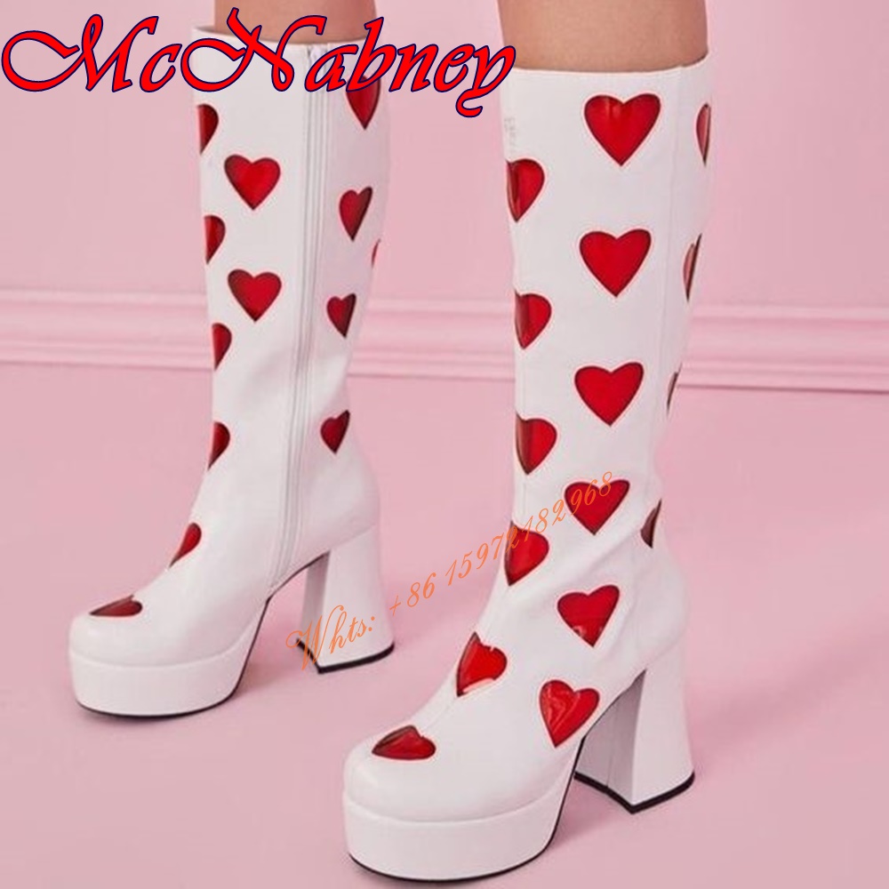 Product Name:Sweet Heart Patent Leather Boots Knee High Chunky High Heels Round Toe Women Runway Shoes Side Zipper Patchwork Spring Party