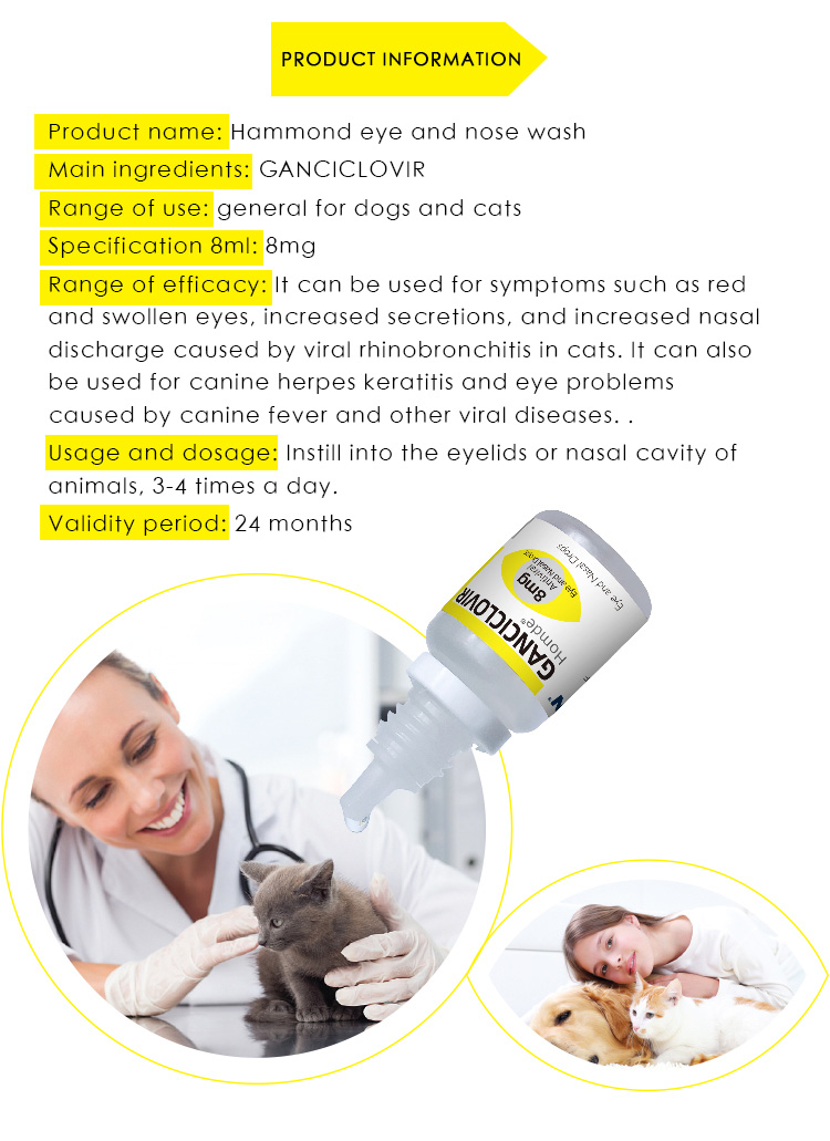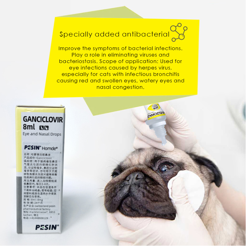 Range of efficacy: It can be used for symptoms such as red and swollen eyes, increased secretions, and increased nasal discharge caused by viral rhinobronchitis in cats. It can also be used for canine herpes keratitis and eye problems caused by canine fever and other viral diseases. .