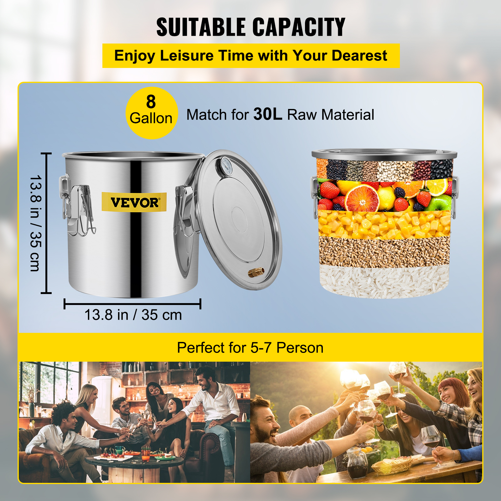 • Sufficient Capacity: This moonshine still provides you with a fermentation capacity of 3/5/8 gallons. Boiler barrel: 9.8" x 9.8" (25 x 25 cm)/11. 8" x 11. 8" (30 x 30 cm)/13.8" x 13.8" (35 x 35 cm), condenser: 7.9" x 4.3" (20 x 11 cm), thumper keg: 7" x 4" (18 x 10 cm), which can ferment up to 12/20/30 liters of raw materials. Perfect for family-together parties. All parts are made of food-grade materials, including silicone, stainless steel, and copper.
