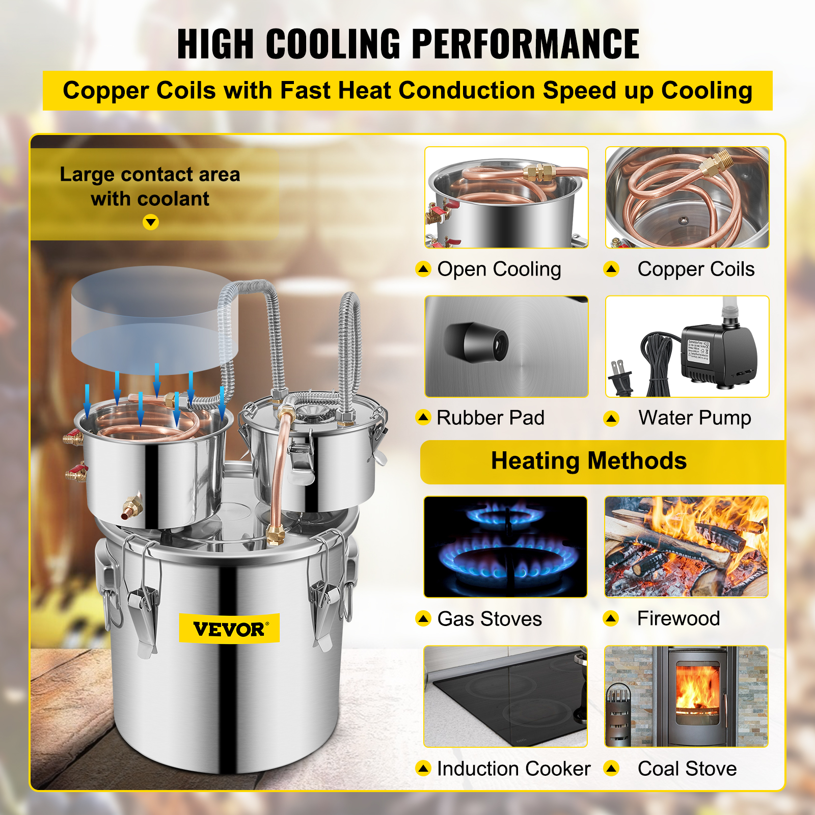 • Rapid Cooling: The distillery kit adopts an open cooling method. The copper coil has rapid thermal conductivity and has a large contact area with the coolant, providing a lower distillation temperature. A circulating water pump is attached to save cooling water. The rubber pad under the condenser can insulate and accelerate cooling.