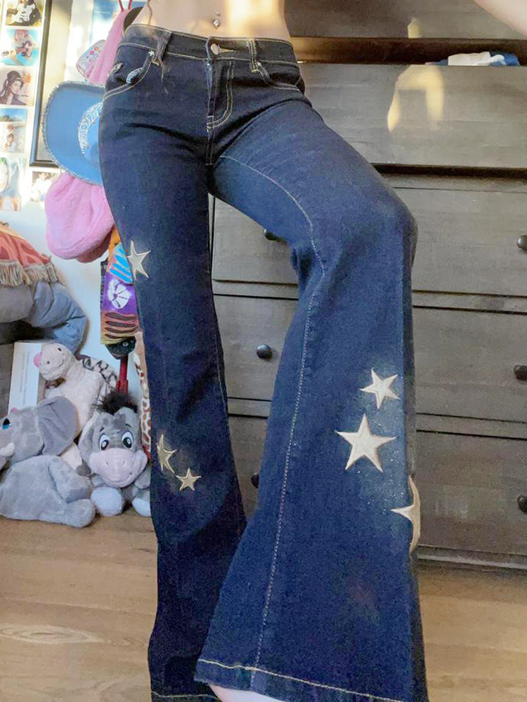 Waatfaak Star Printed Streetwear Y2K Jeans Vintage Low Waist Pockets Blue Denim Skinny Flare Jeans Women Low Rise Grunge Retro
