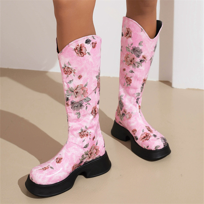 Women Boots 2022 Trend Luxury Winter Retro Round Head Small Platform Women Shoes Casual Mid Heel Print Ladies Knee High Boots