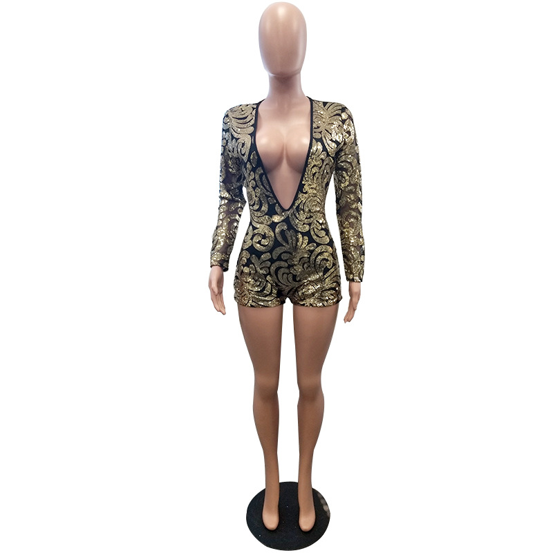 New 2019 European and American women's sexy deep V-neck printed Sequin Jumpsuit Size Chart :1 inch=2.54cm