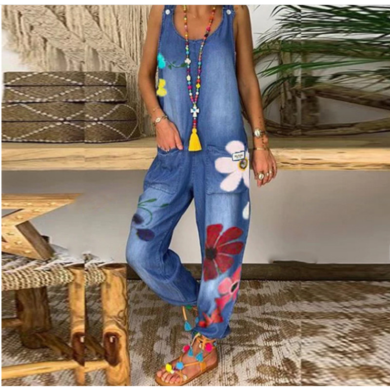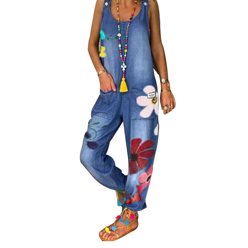 YICIYA Women's Loose Sleeveless Denim Jumpsuit Suspender Denim Collar Wide Bead Jumpsuit Blue Pocket Jeans Jean Femme Pants