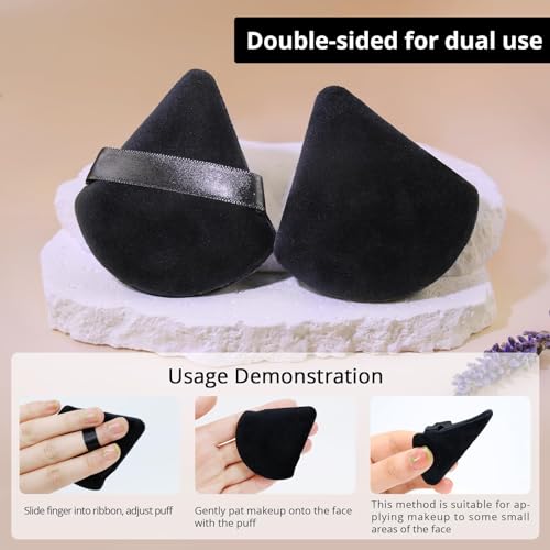 Glad I went with these over the other options. It’s a nice dense and spongy puff. Works great for setting powder. There’s a ribbon strap to keep on your fingers for grip. The triangle shape is good for contouring to your face.