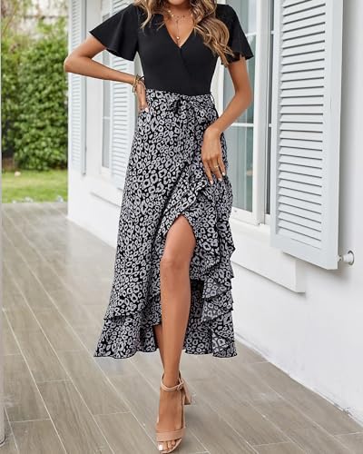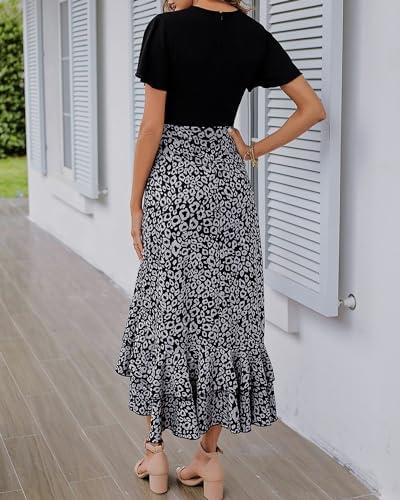 BTFBM Women's V Neck Casual Summer Dresses Patchwork Floral Ruffle Maxi Dress