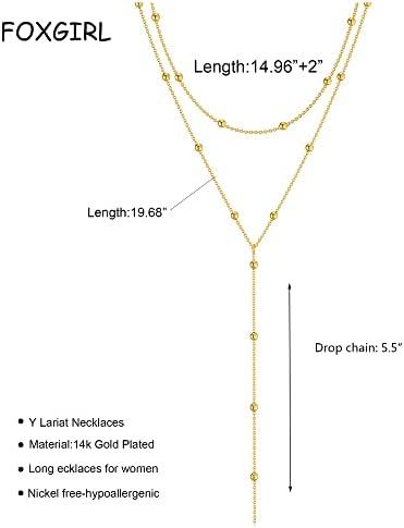Foxgirl Lariat Gold Necklace for Women, Dainty Long Necklace 14k Gold Plated/Silver Y-Shaped Pendant Necklace Trendy Layered Cz Beaded Chain Drop Necklaces Simple Gold Jewelry For Women Gift