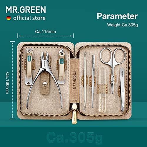 I am thoroughly impressed with the quality and design of this MR.GREEN manicure and pedicure kit. Each tool is impeccably crafted from high-quality stainless steel, ensuring durability and precision. The PU leather case is not only stylish and compact but also incredibly practical, keeping everything organized and secure. Definitely a worthwhile investment for personal care. Highly recommended!